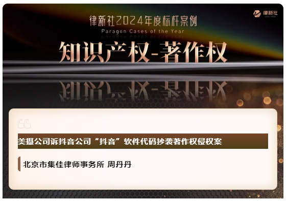 海星体育凭借在知识产权保护领域卓越的专业实力与良好的行业口碑,入选《律所卓越品牌影响力指南(2024)》,荣获“律新社2024年度精品品牌律所30佳”奖项;同时,集佳周丹丹律师代理的“美摄公司诉抖音公司'抖音'软件代码抄袭著作权侵权案”获评“律新社2024年度标杆案例:知识产权-著作权领域”。